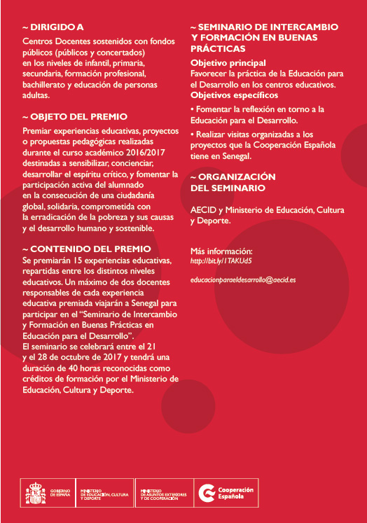 Se premiarán 15 experiencias educativas, repartidas entre los distintos niveles educativos para proyectos llevados a cabo en el curso escolar 2016-2017 tanto de forma individual como en agrupación. Además, un máximo de dos docentes responsables de cada experiencia educativa premiada viajará a Senegal para participar en el "Seminario de Intercambio y Formación en Buenas Prácticas en Educación para el Desarrollo". El seminario se celebrará entre el 21 y el 28 de octubre de 2017 y tendrá una duración de 40 horas reconocidas como créditos de formación por el Ministerio de Educación, Cultura y Deporte.