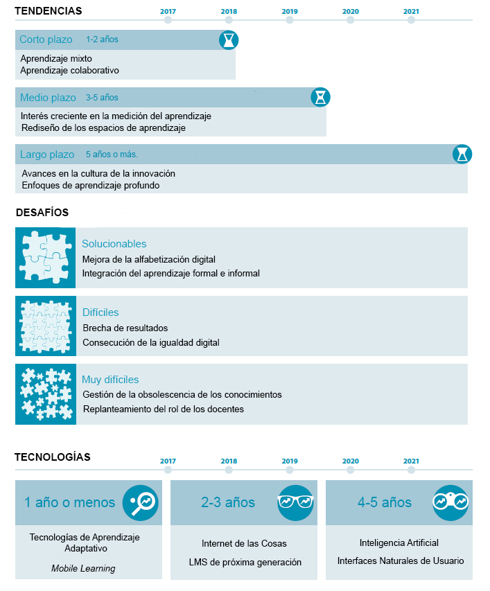 Pero centrándonos en la edición de 2017, encontramos que muchas de las tendencias, desafíos y tecnologías se repiten respecto a la edición pasada. Realmente no se repiten, evolucionan, sobre todo en cuanto a las tecnologías se refiere. Esa es la clave. Por ejemplo, el aprendizaje móvil no presenta las mismas características ni el mismo potencial actualmente que hace algunos años, en absoluto. O las mismas analíticas de aprendizaje, un campo en continuo desarrollo y que buscan ser plenamente integradas en las próxima generación de Sistemas de Gestión del Aprendizaje (LMS).