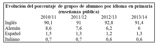 Como se aprecia en la gráfica, el inglés tiende a monopolizar esta enseñanza en detrimento de las demás opciones. El inglés ocupa una posición hegemónica con el 91,4% de clases de los citados niveles, lo cual supone un descenso por primera vez en la serie histórica, le siguen el alemán, que a pesar de su constante bajada aún conserva el 6%, y las demás lenguas se mantienen más o menos estables: el español con un 1,3%, el italiano con un 0,6% y el portugués con un 0,1%. El árabe desapareció de los porcentajes significativos en 2007. En la enseñanza privada el inglés se imparte en el 93% de las clases, el alemán en el 4,2%, el español en el 1,7% y el italiano en el 0,2%.