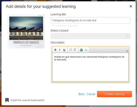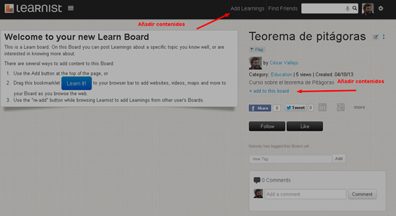 Los cursos se denominan 'boards' y se componen de 'learnings' que, en principio son enlaces a recursos de Internet o imágenes que tengamos guardadas en nuestro ordenador.