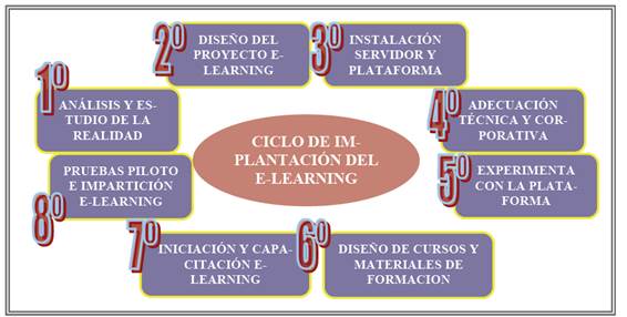 Un ejemplo claro del proceso a seguir para la implantación del e-learning en nuestra tarea diaria lo tenemos en el siguiente cuadro.