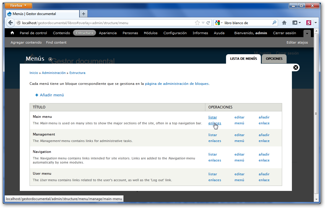 Accedemos a la opción Estructura del menú de administración y seleccionamos Menús.