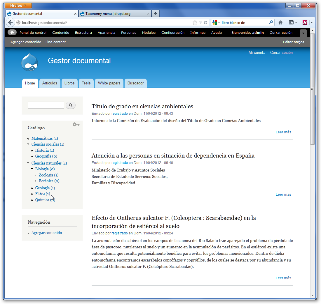 En primer lugar instalaremos y habilitaremos el módulo Taxonomy menu tal como se indica en el apartado Instalar módulos contribuidos.