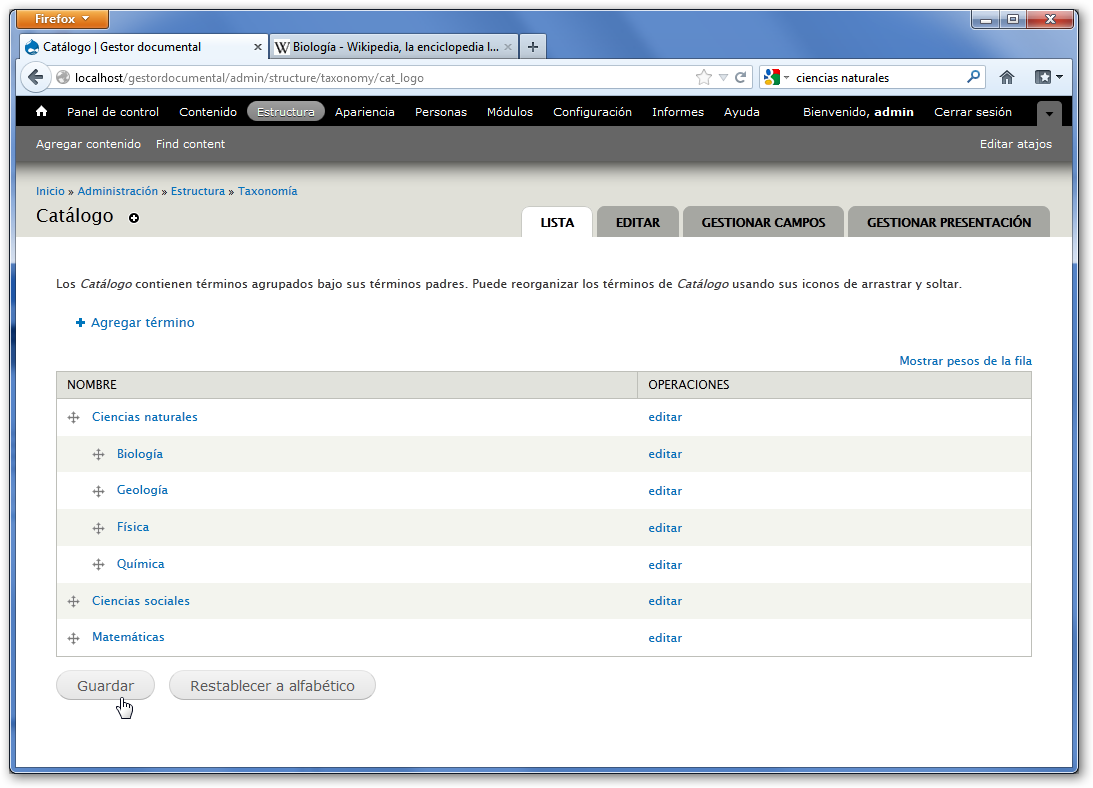 Le damos como nombre 'Catálogo' y añadimos una descripción y hacemos clic en el botón Guardar.