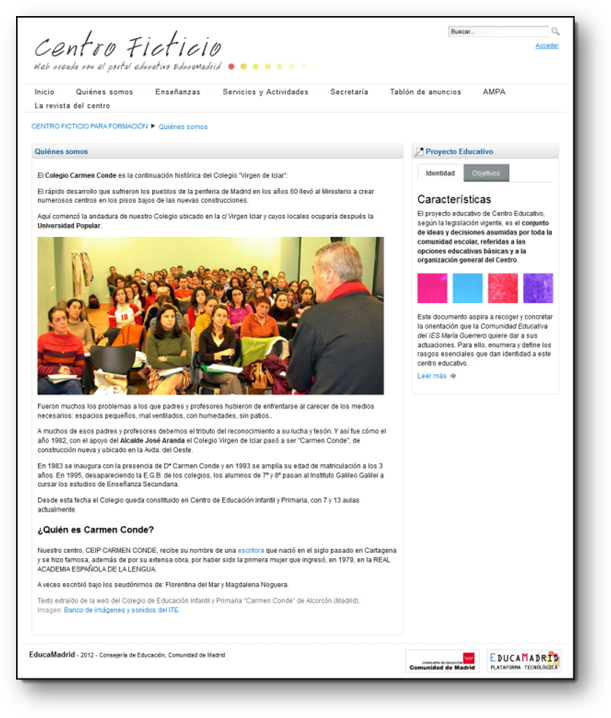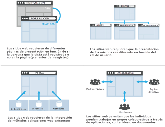 • Mostrar información diferente en función del tipo de usuario. Siguiendo con el ejemplo del centro anterior, ciertas páginas podrían ser visibles sólo para determinados usuarios del centro, como los profesores. De esta forma se pueden suministrar páginas específicas para usuarios que cumplen alguna condición de perfil o rol en el centro educativo.